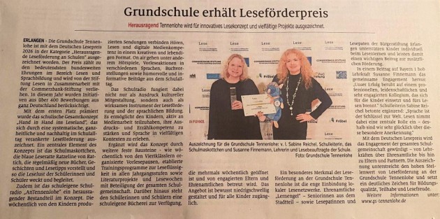 Beim diesjährigen Schülerlandeswettbewerb "Erinnerungszeichen 2022/2023 - Erforscht die Geschichte und Kultur eurer Heimat!" hat unsere Grundschule für die Radiosendung "Ein ganz besonderss Jubiläum ... Der Erlanger Stadtteil Tennenlohe wird 50" einen Anerkennungspreis erhalten. Wir freuen uns sehr über diese Auszeichnung!
