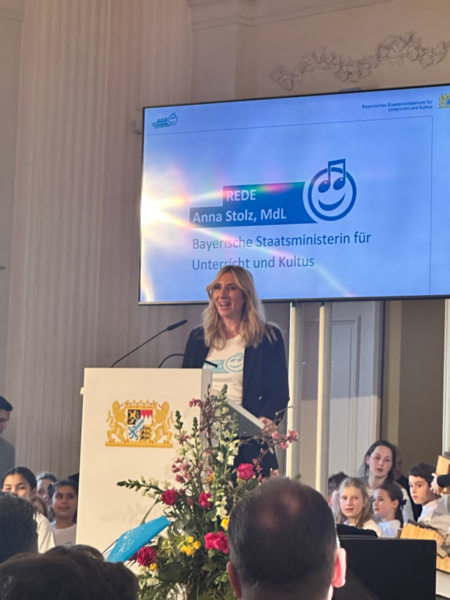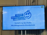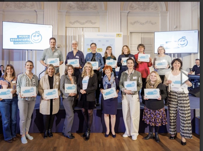 Am 06. März 2026 wurde in München das Profil der "Musikbegeisterten Grundschulen" verliehen. Auch unsere Schule wurde zertifiziert. Neben einem repräsentativen Profilschild erhalten wir für unser außerordentliches Engagement einen Einmalbetrag in Höhe von 1.000 Euro, der insbesondere der Umsetzung von musikalischen Aktivitäten wie gemeinsamen Projekten beispielsweise mit Verbänden, Vereinen sowie Musikerinnen und Musikern vor Ort dient. Bayerns Kultusministerin Anna Stolz gratuliert zur Zertifizierung: „Musik verbindet – sie stärkt das Gemeinschaftsgefühl, überwindet Unterschiede und gibt unseren Schülerinnen und Schülern die Möglichkeit, ihre Gefühle auszudrücken." Wir freuen uns über die Auszeichnung!