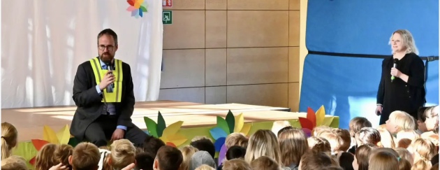 Diesmal waren auch sehr viele Ehrengäste anwesend, so unter anderem unser Oberbürgermeister Dr. Florian Janik und die Schulamtsdirektorin Jeannette Heißler. Der Bürgermeister überreichte den Kleinen die Sicherheitstrapeze und bat sie eindringlich, diese auf dem Schulweg auch immer zu tragen. Denn solche leuchtenden Westen können Leben retten, gerade in der dunklen Jahreszeit, wenn Kinder im Straßenverkehr nicht so gut zu sehen sind.