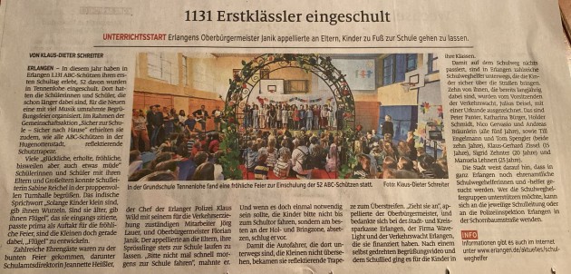 Sogar die Presse war anwesend und berichtete über unsere Einschulungsfeier in den Erlanger Nachrichten.