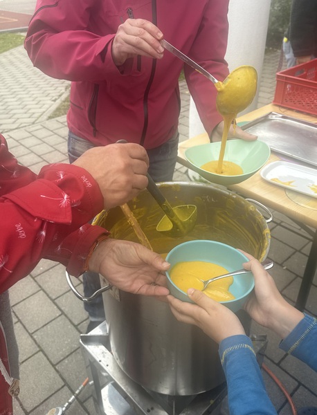 Sehr musikalisch feierten wir diesmal das Erntedankfest. Wir sangen gemeinsam Herbstlieder mit Tradition. Drei Klassen präsentierten im Rahmen der Feier auch noch eigene Beiträge, die beim Publikum prima ankamen. Danach gab es Kürbis-Kartoffel-Suppe, mit Gemüse aus unserem Schulgarten. Das schmeckte richtig lecker! Vor allem, weil die Schüler das Gemüse selbst geerntet, gewaschen, geschnitten und gekocht hatten.